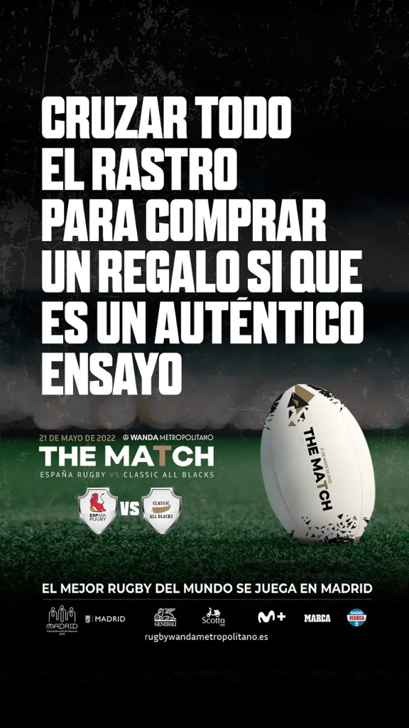 La línea publicitaria de KiwiHouse para este partido, TheMatch, enlaza la vida cotidiana en Madrid con el propio rugby. Sus grafismos han sido publicados en todas las redes sociales de los organizadores.