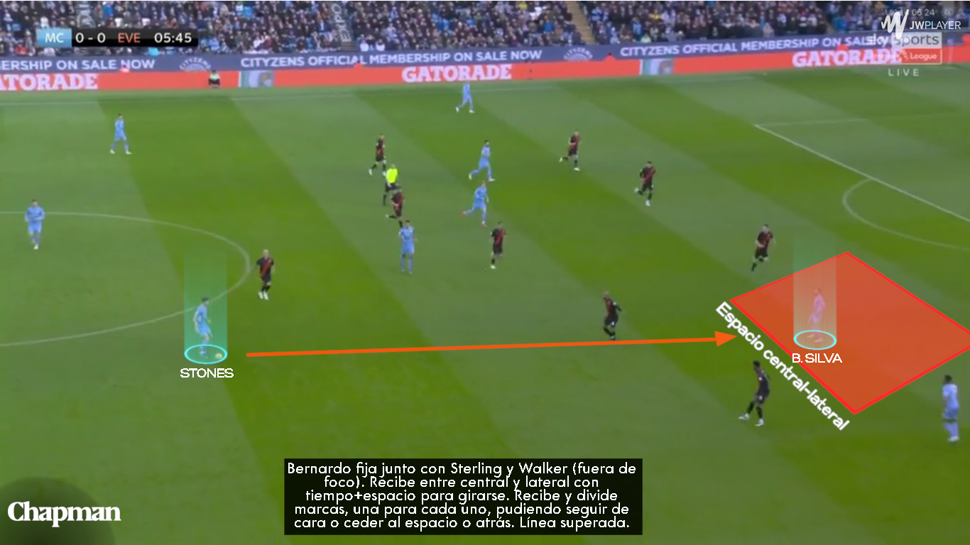 Recordemos que la zona de acción de Bernardo Silva se ha diversificado enormemente, y ha funcionado como interior a todas las alturas, combinándose, en muchos casos, con Kevin De Bruyne entre líneas; sirviendo uno como atractor para progresar interiormente.