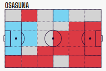 (Imagen: Zonas de dominio de Osasuna (azul) y rivales (rojo) de la 21/22 y 22/23 respectivamente)