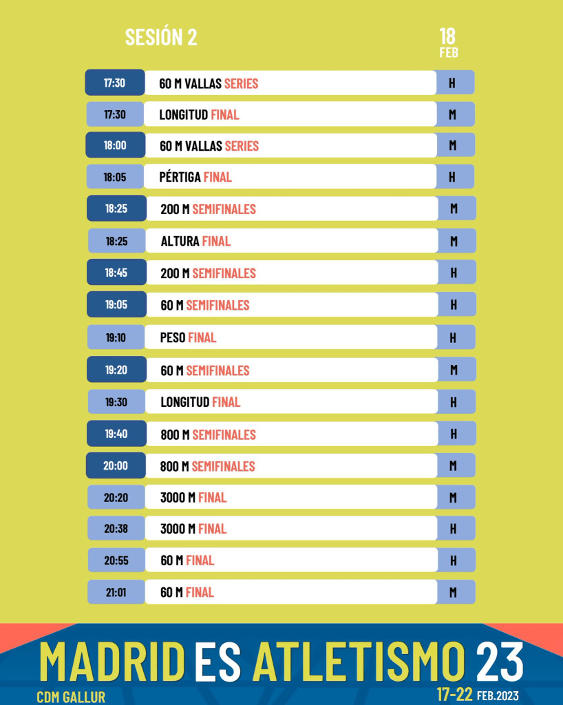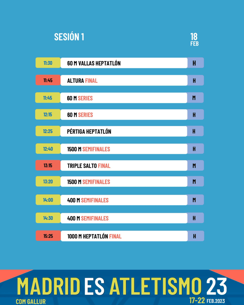 ¡Buenos días desde Gallur! Se respira atletismo en la sede del absoluto. Hoy, una jornada de doble sesión (mañana y tarde) en la que tendremos muchísimas finales. Os dejamos los horarios con grafismos de la RFEA.