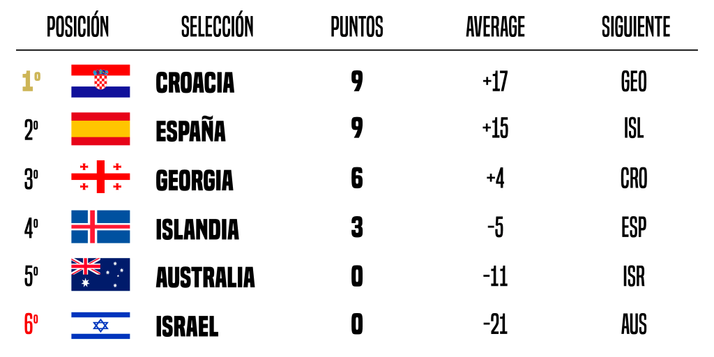 Australia no ha podido empezar con peor pie. Las derrotas con Croacia y España dejaron a los oceánicos fuera de la contienda por el oro. A partir de entonces, lo que parecía un paseo triunfal se ha convertido en una lucha muy complicada. Esta derrota con Islandia les deja provisionalmente quintos, y obligados a ganar los dos partidos que les quedan (Georgia e Israel) para siquiera tener una oportunidad de alcanzar esa tercera plaza. El average que consigan ante Israel será importantísimo.